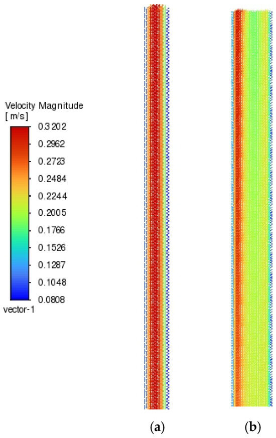 Figure 10 presents velocity profiles within the unsealed air cavity with a thickness of 2 cm (Figure 10a) and 5 cm (Figure 10b). The maximum velocity for the case of a 2 cm air cavity reaches 0.32 m/s, while for the 5 cm air cavity configuration, it is slightly lower at 0.30 m/s. The minimal difference in air velocity between the two air cavity thicknesses is primarily due to the relatively small increase in air temperature within the cavity subject to natural convection. Since the temperature within the air cavity does not rise significantly, the driving force for natural convection remains similar in both cases, leading to only a slight variation in the magnitude of air velocities. For the case of the 2 cm air gap (Figure 10a), the velocity profile shows a high velocity region near the center of the cavity, with air velocities rapidly decreasing towards the surfaces. In contrast, the case of the 5 cm air cavity (Figure 10b) exhibits a broader region of high velocities, particularly near the warmer concrete wall. The higher velocity near the warmer wall decreases the density of the air, causing it to rise faster and resulting in the profile depicted in Figure 10b.