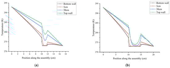 Temperature profiles along the horizontal cross-sections at different heights of the assembly with unsealed air cavity thicknesses of (a) 2 cm and (b) 5 cm under natural convection.
