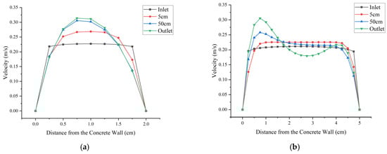 Velocity profiles within the unsealed air cavity with thicknesses of (a) 2 cm and (b) 5 cm for the case of forced convection.