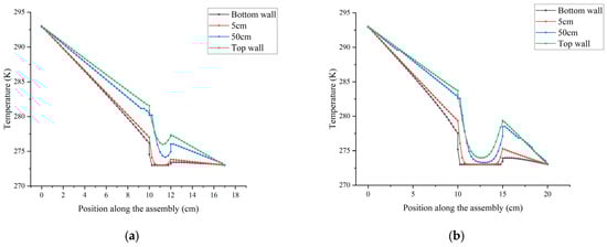 Figure 11 illustrates more clearly temperature profiles along cross-sections of all the layers of the insulated wall assembly at different heights in the case of an unsealed air cavity subject to natural convection. The temperature profiles for two thicknesses of the air cavity are shown in Figure 11, including 2 cm (Figure 11a) and 5 cm (Figure 11b). As depicted in Figure 11, the presence of the air cavity disturbs the linear temperature variation across the wall sections due to colder air flowing from the bottom to the top of the cavity. For the case of a 2 cm air cavity, the air temperature increases substantially from 273 K at the bottom section to an average of 283 K at the top section. However, for the case of 5 cm, the average air temperature at the top outlet of the air cavity is merely 277 K. This difference in outlet air temperature is associated primarily with the difference in the volume of air flowing through the air cavity. Higher air volume for the case of a 5 cm thick cavity results in a lower increase in air temperature compared with the case of a 2 cm thick cavity with lower flowing air volume. A higher flowing volume results in reduced thermal interactions between the air and the cavity surfaces. Moreover, the difference in air temperatures within the air cavity leads to differences, albeit slight, in the temperatures in both concrete and insulation layers. Indeed, cooler air temperatures for the case of a 5 cm thick cavity slightly increase convective heat transfer and lower the temperatures of adjoining surfaces and subsequently the temperatures across the solid layers of the wall assembly. The overall effect of a higher thickness of unsealed air cavity subject to natural convection is a lower total thermal resistance of the insulated wall assembly, as indicated by the results shown in Figure 7.