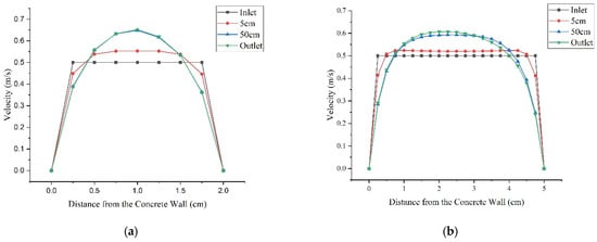 Figure 12 shows the air velocity profiles along horizontal cross-sections the cavity within the retrofitted wall assembly for two cavity thicknesses (a) 2 m and (b) 5 cm. The x-axis shows the distance from the concrete wall’s outer surface, while the y-axis displays the magnitude of the air velocity. The different curves represent the air velocity profiles estimated at various heights of the wall and the air cavity, including the inlet (i.e., bottom of the wall), 5 cm, 50 cm (i.e., middle section of the wall), and the outlet (i.e., top of the wall). For the case of a 2 cm air cavity (Figure 12a), the air velocity reaches a maximum value of 0.32 m/s around x = 1 cm. Closer to the cavity surfaces (i.e., x = 0 cm and x = 2 cm), the air velocity decreases significantly. Indeed, the air velocity at the cavity surfaces reaches 0 m/s in accordance with the no-slip conditions assumed in the CFD modeling analysis. This pattern is consistent across different wall heights with similar parabolic profiles for air velocity within the cavity, with the highest air velocity occurring around the middle of the air cavity.