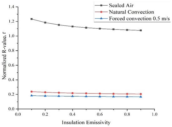 In this section, the effects of the emissivity of the air cavity surfaces are evaluated on the overall thermal performance of retrofitted wall assemblies with insulated panels. Figure 17 illustrates the variations in the normalized R-value, r, with the cavity surface emissivity for three airflow cases, including a sealed air cavity and an unsealed air cavity with natural and forced convection, with an airflow velocity of 0.5 m/s.