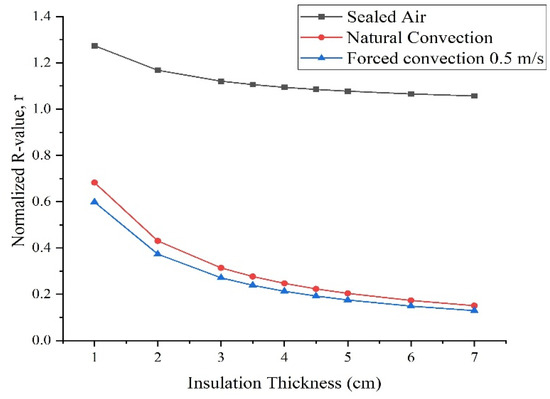 This section investigates the impact of the insulated panel thickness on the overall R-value for the retrofitted wall assembly. Figure 18 outlines the variation in the normalized wall assembly R-value, r, as a function of the insulated panel thickness for three airflow cases. The results of Figure 18 are obtained when the air cavity thickness is 5 cm, the surface emissivity is 0.9, and the air velocity for the case of forced convection is 0.5 m/s.