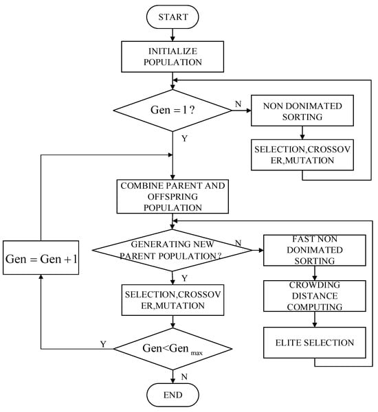 Since the objective function contains two sub-objectives, the overall evaluation model is a multi-objective optimization model. The NSGA-II algorithm is adopted to simultaneously optimize the two objective functions in the model. Based on the basic genetic algorithm (GA), three improvement measures, namely the fast non-dominated sorting algorithm, the elitist strategy, and the crowding degree comparison operator, are employed. These measures can accelerate computational efficiency and improve convergence robustness but do not alter Pareto-optimal outcomes. The algorithm flow chart is shown in Figure 2.