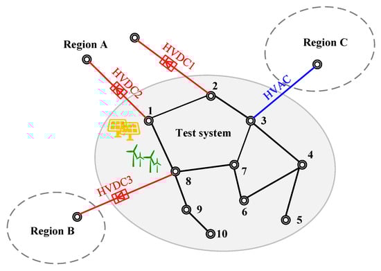 The sending-end power grid in China is used as a test system to verify the effectiveness of the proposed method. The grid topology is presented in Figure 3. The topology of the test system is equivalent to containing 10 key nodes with 500 kV voltage levels and 11 AC transmission lines. And its combination of power generation resource types, including SGs, WT, and PV. The system conducts power exchange with Region A and Region B via three HVDC lines and is connected to Region C through an AC tie-line with a capacity of 500 MW. We tested the capacity requirements of the multi-type resource mix schemes for the system in two stages.