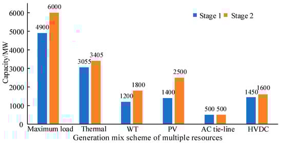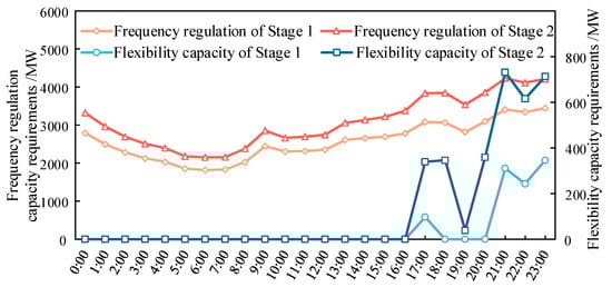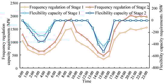 The flexibility capacity requirements in the normal state and frequency regulation capacity requirements of the system for the two stages are shown in Figure 6. There are mainly upward flexibility gaps during the evening peak period in both stages. Compared with Stage 1, the maximum load in Stage 2 has increased by 1096 MW, but the newly added thermal power units of the existing generation mix scheme are only 350 MW. The power output of PVs is close to 0 during the evening peak periods (20:00–22:00), and the power output level of WTs is also at its lowest level throughout the day. Therefore, the upward flexibility shortage in Stage 2 has significantly increased, and it is difficult to meet the load demand relying solely on the existing generation mix scheme.
