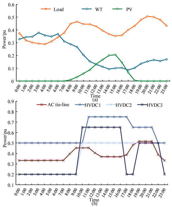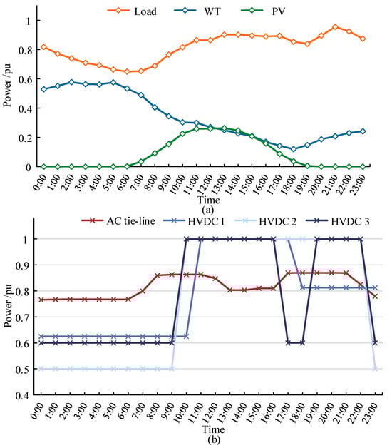 Scenario 1 represents a typical operating scenario with a high annual load level. The system load demand and output prediction of renewable energy with a 95% confidence level are shown in Figure 5a. In Scenario 1, the daily power demand of the test system remains at a relatively high level throughout the day, and the load exhibits a double-peak characteristic. WTs have a relatively high generation level during the low-load periods, showing an anti-peak-shaving characteristic. During the noon peak periods (13:00–17:00), the power generation of PVs is relatively abundant, but the power generation of WTs is relatively small. During the evening peak periods (20:00–22:00), the output of both PV and WT is relatively small. Figure 5b shows the external power transmission requirements of the AC tie-lines and HVDC lines in Scenario 1. During the noon peak periods (13:00–17:00), all three DC lines are operating at full capacity. However, during the evening peak periods (20:00–22:00), the transmission capacity of HVDC 1 is relatively low. Therefore, it is more likely to encounter a shortage of upward flexibility regulation capacity in this scenario.