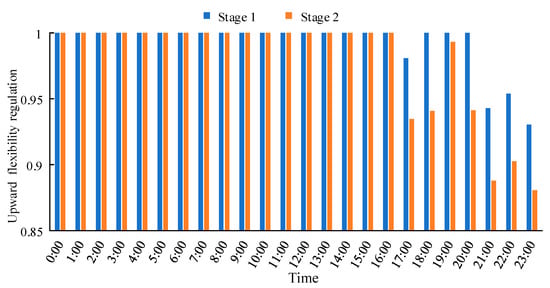 The flexibility regulation of the system is shown in Figure 10. There is no upward insufficient upward flexibility in the system. If additional flexible resources are not considered, the downward flexibility of the system is at a relatively low level during the early morning and afternoon periods. Even the curtailment rate of renewable energy within the region is relatively high during the low-load periods of 14:00–16:00 in Stage 1. In Stage 2, due to the increase in the system load demand, the downward flexibility levels at multiple periods are slightly improved compared with those in Stage 1. The computation results of the flexibility expectation and the flexibility duration ratio are shown in Table 3. The downward flexibility duration ratio of the system in Stage 1 and Stage 2 is 37.5% and 41.7%, respectively. The downward flexibility expectation in Stage 2 increases by 4.8% compared with that in Stage 1, and the curtailment rate of renewable energy decreases by 6.24%.