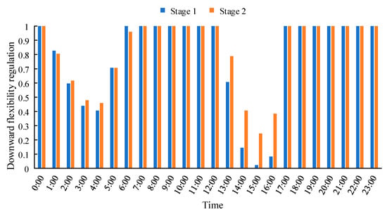 The regulation capacity requirements in typical Scenario 2 are shown in Figure 9. There is no shortage of upward flexibility regulation capacity in both stages in Scenario 2. However, there is a significant shortage of downward flexibility regulation capacity during the periods of 1:00–5:00 and 13:00–16:00. The maximum requirements for downward regulation capacity in the early morning period occur at 3:00, which is mainly caused by the relatively low load demand level and the large power generation from WTs. Compared with Stage 1, the installed capacities of WTs and PVs in the test system of Stage 2 increase by 600 MW and 1100 MW, respectively. The peak load in Stage 2 increases by 607.45 MW compared with that in Stage 1, and the valley load increases by 346.1 MW compared with that in Stage 1. Therefore, the demand capacities for downward regulation from 1:00 to 5:00 and from 13:00 to 16:00 in Stage 2 are slightly higher than those in Stage 1.