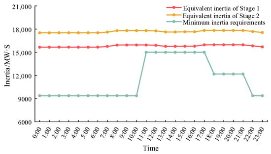 The minimum inertia demand level of the system, computed based on the two frequency security index limits in typical Scenario 1 and the equivalent inertia of the system obtained from the assessment model, is shown in Figure 11. During the periods from 11:00 to 17:00, the transmission power of HVDC1 is relatively high. If a bipolar blocking event occurs at these times, the active power deficit in the system will be larger. The minimum inertia demand of the system is relatively high during these periods. The thermal power units with large online capacities provide a relatively sufficient rotational inertia. Therefore, after quantifying the frequency regulation capacity demand of the system, the equivalent inertia obtained from the assessment model can meet the minimum inertia level required for the system frequency security. Thus, it can be seen that the system inertia level will be maintained at a relatively high level as much as possible to ensure the system frequency security after considering the constraints of the two frequency security indices in the form of inertia.