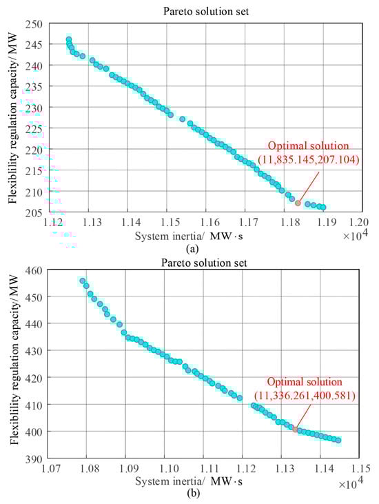 The Pareto solution set of the system capacity requirements at 15:00 solved by the NSGA-II algorithm in Scenario 2 is shown in Figure 12a. The weight coefficients of both objectives are set to 0.5. The optimal point can be selected from the Pareto solution set through the evaluation function defined in the previous text (the minimum inertia representing frequency security capacity requirement is 11,835.145, and the minimum flexibility regulation capacity requirement is 207.104 MW). Similarly, the corresponding Pareto solution set at 20:00 is shown in Figure 12b. The minimum inertia requirement at this time is 11,336.261, and the flexibility capacity requirement is 400.581 MW.