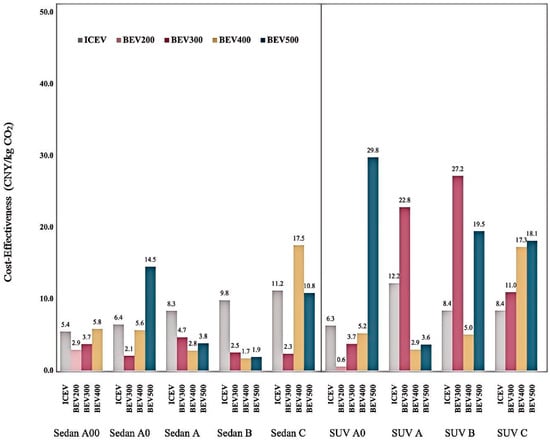 The life cycle assessment (LCA) or life cycle cost alone does not fully reflect the market competitiveness and sustainability characteristics of NEVs, and a cost-effectiveness analysis (CEA) is therefore necessary to justify whether a vehicle meets both environmental and economic feasibility standards. The early studies concluded that NEVs were not cost-effective, which was reasonable considering the immature technological development level of NEVs at that time [28]. Although the CEA framework of the research is still convincing, the market for alternative fuel vehicles (AFVs) has changed considerably since the original research was carried out. Only a few studies have provided updated insights into the cost-effectiveness of electric vehicles, taking into account advancements in technology and changing market conditions. Hybrid electric vehicles (HEVs) were found cost-effective, and BEVs could be cost-effective with increases in gasoline prices or improvements in battery learning rates. Moreover, the cost-effectiveness of BEVs diminishes as the driving range increases [29]. Optimal cost-effectiveness was achieved when the gasoline price reached 9.8 CNY/L [30]. And a CEA on fuel cell vehicles (FCVs) and BEVs was conducted in South Korea and found that FCVs would need a 72.3% reduction in purchase costs to achieve cost-effectiveness, while BEVs would require a 45.3% reduction [31].