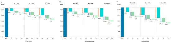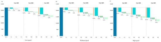 However, influencing factors extend beyond cleaner energy transitions, with technological advancements playing an equally critical role in enhancing the carbon reduction potential of vehicles. The promoting effect of technological progress on carbon reduction throughout the entire life cycle of vehicles has been widely verified. Studies show that lightweighting is an effective way to reduce energy consumption and carbon emissions. For every 100 kg decrease in the weight of a car, the fuel consumption per 100 km can be reduced by 0.4 L, and the carbon emissions can be reduced by approximately 1 kg. Data from the U.S. Department of Energy also shows that for every 10% reduction in a car’s weight, its fuel consumption decreases by 6% to 8% [19]. Reducing the curb weight of automobiles can effectively reduce energy consumption. New energy vehicles have an urgent demand for lightweighting [20]. Lithium-ion batteries, as the mainstream power battery technology, have seen their energy density increase from the early 100–150 Wh/kg to around 250 Wh/kg, and their driving range has also risen from the initial 100 km to over 400 km. Meanwhile, new battery technologies such as solid-state batteries, lithium–sulfur batteries, and sodium-ion batteries are also constantly making breakthroughs, enhancing energy efficiency and driving range while also promoting carbon reduction [21]. Research reports from institutions such as the International Energy Agency (IEA) show that with technological advancements in engine technology, electric drive systems, and other areas, the energy efficiency of various vehicles has been continuously improving, and carbon emissions per unit of mileage have been continuously decreasing [22]. It can be seen that technological progress will also promote carbon reduction by improving the energy efficiency of vehicles.