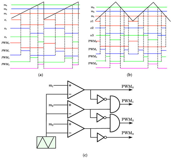 Since the circuit operates under open-loop control, the output voltages are regulated by adjusting the corresponding PWM duty cycle. In Figure 10, the input modulation values m1, m2, m3 are compared with the triangle carrier, which subsequently generates centrally aligned PWM signals. To output the proper sequential switching signals for MOSFETs, the logic circuit is implemented in a specific mode. Sequential PWM signals for switching action are shown in Figure 10b. Note that the triangle carrier generates the symmetrical PWM sequence, and the average current for the four switching states are the same, which improves the accuracy in the derived.