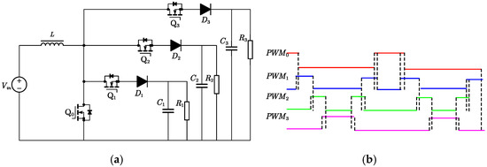 Alternatively, the overvoltage issue discussed in Section 2.1 (Topology) can be resolved through pulse–width modulation (PWM) signal adjustment by introducing controlled overlap time intervals in the gate drive signals of adjacent MOSFETs, as shown in Figure 3b. A brief interval is intentionally allocated to allow simultaneous conduction of both devices. This overlap ensures the smoothness of the inductor current, thereby eliminating abrupt current spikes that induce overvoltage transients. Additionally, this strategy reduces system costs by minimizing reliance on voltage-clamping components (e.g., TVS diodes) and mitigates power losses associated with voltage regulation, ultimately enhancing overall conversion efficiency.
