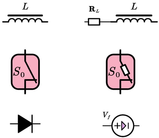 - MOSFET parasitic resistance incorporation: The MOSFET device is represented by an equivalent model incorporating series resistance, graphically depicted as a switch–resistor combination. This refinement quantitatively captures the influence of the MOSFET’s on-state resistance.