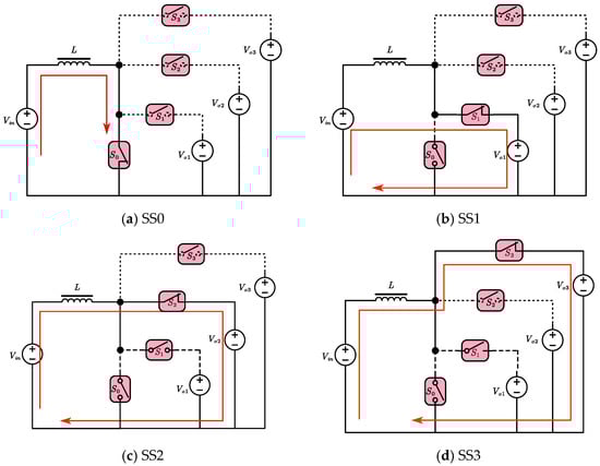 In the continuous conduction mode (CCM), as shown in Figure 8, the inductor current of the circuit remains above zero throughout the entire switching cycle, ensuring a continuous flow of energy. The CCM operation is characterized by two primary phases: Phase 1, the inductor charging phase (where switch S0 is turned on, allowing the inductor to store energy from the input source), and Phase 2, the inductor discharging phase (where switch S0 is turned off, and the stored energy is transferred to the output branches corresponding to the different switching states, maintaining a steady current flow).