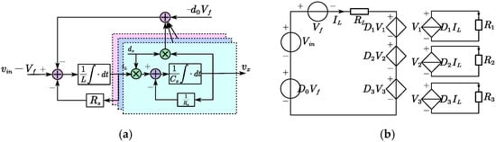 With the averaging modeling approach explained above, the nonlinear circuit model with consideration of some circuit parameters can be drawn as a signal flow diagram, shown in Figure 6a. Since this dynamic model is represented in differential equations with nonlinear properties, an integration block is used for circuit-state transferring instead of the s-domain diagram as a linear system representation. Explicitly, the inductor current is a first-order system driven by the average voltage across the inductor. On the other hand, the three output voltages are driven by the inductor current and the related duty cycle by which the output capacitor is charged. It can be simplified into a first-order linear system if we consider the second term in (15) as an average input. However, due to the three outputs sharing the same inductor current multiplied by related duty cycles, any disturbance in inductor current must cause output voltage fluctuation. In other words, the three outputs are indirectly coupled through the inductor current. The output voltage coupling problem can also be seen in Figure 6a, in which the inductor current drives three output voltage with related interval durations; as a feedback effect, any dynamic process on output will change the inductor current reversely and will be coupled to the other output.