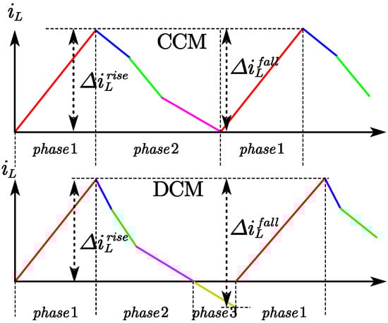 In the first method, as shown in Figure 8, the current ripple during the rising segment is described as ΔiLrise. After that, the current ripple during the falling segment is ΔiLfall, which is an accumulated decrease driven by inductor voltage. From Equations (4), (7), and (19), the current ripple can be linearly derived: