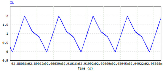 Under the conditions where the duty cycles of the PWM signals for the MOSFETs at each output port are 0.25, 0.2, and 0.2 and the parallel resistance at the respective output ports are 80 Ω, 100 Ω, and 75 Ω, the critical inductance value for the current circuit parameters is calculated in (32) to be 42 μH. By setting the inductor value as 42 μH, as well as the duty cycles and resistor values, the simulated inductor current (IL) waveform is shown in Figure 12. This result indicates a correction in the theoretical steady-state derivation and critical mode analysis.