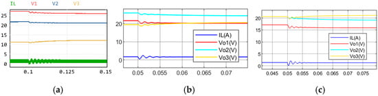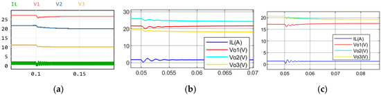 To validate the SI-SIMO boost converter modeling accuracy, a nonlinear model and a small-signal model at the steady-state operation point are built in MATLAB/Simulink 2024a. By introducing small input perturbations, the state variables’ transient responses are compared between the PSIM switching circuit model and the Simulink model. In Figure 13, the circuit variables are tested with the input voltage step of 12–13 V. It is observed that the inductor current and output voltages are increased with transient dynamics. Moreover, the output voltages are the same proportion since the duty cycle and load resistance are constant in this test condition. In addition, the original nonlinear differential equation model is more accurate than the small-signal model approximation at the static operation point. It is the fact that the original dynamic model includes the all-necessary state variable coupling terms in the equation, whereas the small-signal model is a linear approximation with state-space equations.