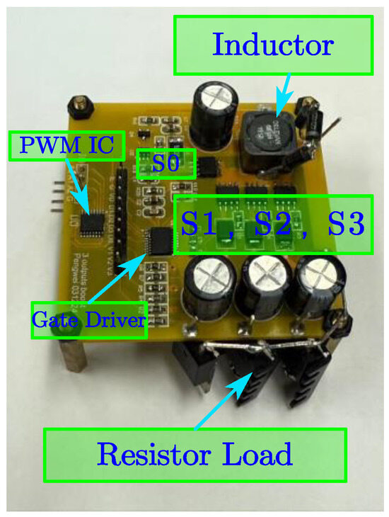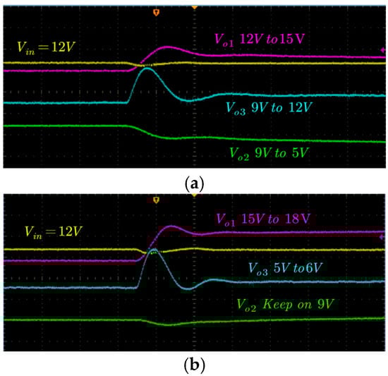 To validate the proposed SI-SIMO boost converter, an evaluation board with an input of 12 V is designed, shown in Figure 17. The single inductor is tied to switch S0 and three unidirectional switches S1~S3, which comprise a diode series with the MOSFET. Sequential PWM logic is generated by and decoded by IC 74HC128. A bootstrap gate driver IC DRV8300D is used to drive the four switches for low-cost consideration. In Figure 18, the three output voltages are monitored in scope. With proper duty cycle step input, the output voltages are changed from one operation point to another, demonstrating the separated output control capability. It is also observed that the three outputs are coupled during the transient dynamics. This result is firmly consistent with the theoretical analysis in this paper and validates the simulation results accordingly. Future research will focus on its closed-loop control and decoupled regulation for its high-performance applications.