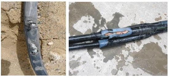 Due to the rapid development of urbanization, underground cables play an increasingly vital role in urban power supply and are widely used []. However, power cables have inherent drawbacks, such as unstable insulation performance during manufacturing, potential insulation damage due to collisions during installation, and long-term exposure to humid underground environments that can lead to water tree aging [,], as shown in Figure 1. Statistics show that 32% of urban distribution cables in China have been in operation for over 15 years, and insulation aging accounts for more than 47% of total cable failures. These issues cause insulation degradation, significantly reducing performance and leading to insulation breakdown accidents []. It can be seen that the aging of cables has a non-negligible impact on the normal operation of the power grid. Effective fault detection of cables should be carried out as soon as possible to prevent serious losses.