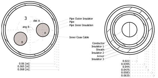 The three-phase cable arrangement and single-cable structure are depicted in Figure 3. A single cable comprises a conductor, inner semiconductor layer, insulation layer, outer semiconductor layer, metal shielding layer, filler layer, inner sheath, armor layer, and outer sheath.