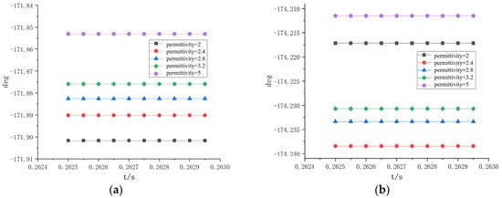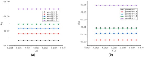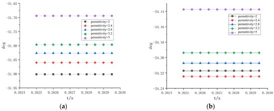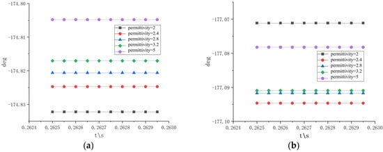 After comparing the above subfigures, it can be seen that as the dielectric constant increases, the phase angle of the cable sheath to ground current increases from −54.83° to −54.72°, while the phase angle of the steel armor to ground current increases from −57.07° to −57.04°. The increases in the phase angle amplitude of the two are 0.11° and 0.03°, respectively. By analyzing the trend of the current phase angle changes in aging phase A, it can be seen that the sheath to ground current phase angle shows a gradually increasing trend, while the changes in the steel armor to ground current phase angle are relatively irregular, and the two trends do not reflect consistency. In order to compare the phase angle variation characteristics of the aged and unaged phases of cables more specifically, a current phase angle variation diagram of the unaged phase B was drawn, as shown in Figure 7.