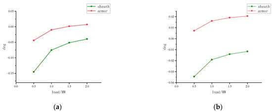 - When the degree of cable aging is the same, the phase angle changes of the cable grounding current are different under different loads. As the cable load increases, the phase difference of the aging phase grounding current shows a gradually decreasing trend. The phase difference of the sheath grounding current decreases from −0.145° to −0.039°, the phase difference of the armor grounding current decreases from −0.044° to 0.007°, the phase difference of the non-aging phase sheath grounding current decreases from −0.035° to −0.011°, and the phase difference of the armor grounding current increases from 0.007° to 0.02°. Therefore, it can be seen that the load size of the cable will, to some extent, affect the accuracy of online monitoring of cable aging based on the phase difference of the grounding current.