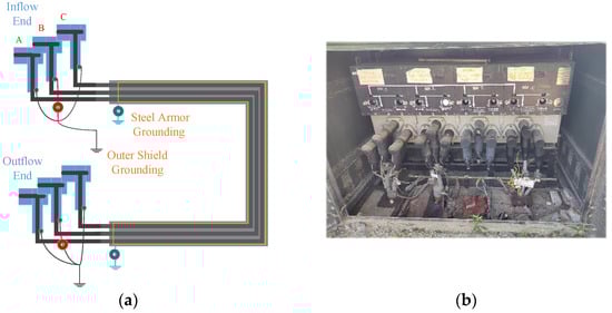 The signal of the grounding current of the cable box during the operation of a branch line is collected by using clamp-type transformers and oscilloscopes. A diagram of the current field collection model and a photo of it in the field are shown in Figure 10. The 10 kV branch coaxial cable is transmitted through underground cables, and each phase cable is stripped and led out to the ring-shaped main unit. The model used is ZR-YJV22-8.7/15-3X400. By using current transformers to collect the main current of the cable, the grounding current of the steel cable and the grounding current of the external shield can be used to obtain the current signals.