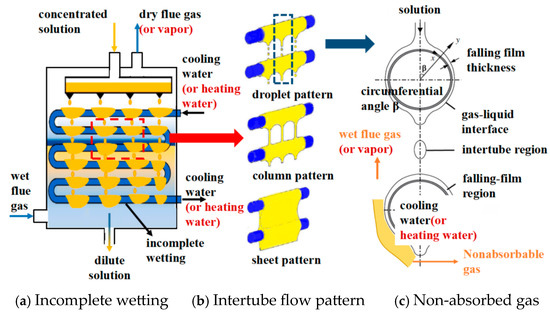 The flow characteristics of HTFFHEs are crucial for the heat and mass transfer efficiency. At low flow rates, “dry spots” may form on the tube surface, leading to incomplete wetting, while at high flow rates, the liquid film becomes thicker, increasing thermal resistance and impeding efficient heat and mass transfer, as illustrated in Figure 1a. As the flow rate increases, the liquid flow transitions through various basic flow patterns, such as droplets, columns, and sheets, between the tubes. Since absorption occurs at the gas-liquid interface, the position and dynamics of this interface vary with different flow regimes, affecting the mass transfer process, as shown in Figure 1b. Additionally, the direction and velocity of the gas flow play significant roles in determining the rates of heat and mass transfer. Notably, when non-absorbed gases are present, an inert gas film may form on the film surface, disrupting the local vapor pressure at the gas-liquid interface and increasing mass transfer resistance, as depicted in Figure 1c. Thus, the interaction between the falling film flow and the heat and mass transfer on the tube outer surface is highly complex. The flow characteristics, in particular, are critical factors influencing the overall performance of HTFFHEs, and this coupling remains a central focus of ongoing research aimed at optimizing heat and mass exchange efficiency.