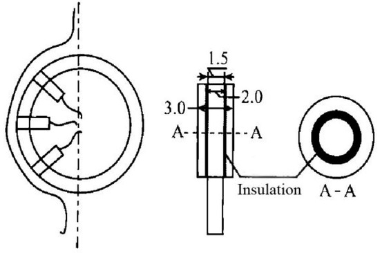 Regarding liquid film thickness measurement, experimental techniques have evolved significantly over time. Table 2 summarizes the working principles, conditions of applicability, and the advantages and limitations of various measurement methods. In the early stages, direct-contact techniques such as electrical conductivity probes— both insertion-type and embedded-type—were commonly employed to measure liquid film thickness. Hou et al. [14], Tan [15], Zhang et al. [16], and Zhao [17] used insertion-type conductivity probes (illustrated in Figure 2), where the probe is immersed in the liquid film. The resistance between two parallel electrodes correlates to the liquid film thickness, based on the difference in electrical conductivity between the liquid and the surrounding air. While this method is simple and easy to apply, it suffers from relatively low accuracy due to factors such as probe size, fluid temperature, and the disturbance of the liquid film flow. The probe can cause a localized thickening of the film near its surface due to surface tension effects. To minimize such disturbances, Guo et al. [18] introduced an embedded bipolar conductivity probe method, where a cylindrical metal wire (1.5 mm in diameter) is embedded into a falling film tube with an outer diameter of 3.0 mm and an inner diameter of 2.0 mm. This probe consists of an anode and cathode connected to a power supply, as shown in Figure 3. This method improves measurement accuracy compared to the insertion-type probe, but it is more complex to manufacture and has limited applicability. In summary, contact-based electrical conductivity probes are primarily suitable for scenarios involving conductive and relatively thick liquid films.