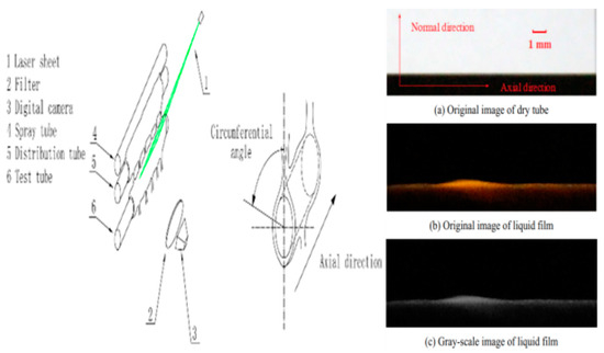 This method offers high measurement accuracy, with a laser focus displacement meter achieving a resolution of 0.01 μm, a laser spot diameter of 2 μm, and a response time of 640 μs, with measurement errors confined to less than 1%. However, its measurable thickness (δ) range is limited to 0.05 mm < δ < 0.3 mm. If the thickness is too small, overlapping reflected light peaks prevent accurate calculation, and if the thickness is too large, the lens system cannot resolve the film at higher frequencies. Lei et al. [22] also introduced the fluorescence intensity method (depicted in Figure 6), wherein a fluorescent agent is added to the liquid, and fluorescence is excited using a laser. The liquid film thickness is then inferred from the measured fluorescence intensity, although calibration can be challenging. Gstoehl et al. [25], Chen [26], and Chen et al. [27] combined fluorescence intensity with digital image processing and used laser-induced fluorescence (shown in Figure 7) to measure liquid film thickness. High-definition cameras capture the fluorescence images of the liquid film, which are processed to determine the film thickness. This method is relatively straightforward and effective for thicker films (δ > 0.2 mm), but image processing can introduce significant errors, with relative errors around 5% and absolute errors of approximately 0.0085 mm. Moreover, a substantial number of images must be analyzed to reduce measurement errors. Additionally, experimental studies on inter-tube flow patterns and surface wettability are primarily conducted through visualization techniques [28], combining high-speed cameras and digital image processing to investigate the evolution of flow patterns, as well as the distribution, development, and wetting characteristics of the liquid film.
