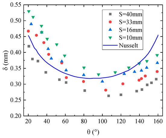Variations in film thickness with circumferential angle at different intertube spacings (smooth tube, d = 25.4 mm, Ref = 574) in Ref. [20] (Yu, 2017).