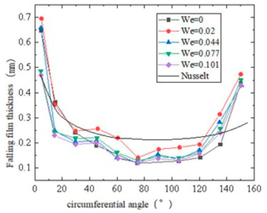 In recent years, there has been growing attention on the impact of gas flow characteristics (such as direction, velocity, and humidity) on liquid film thickness in horizontal falling film flow. Co-current gas flow significantly increases liquid film velocity and reduces liquid film thickness, shifting the circumferential angle of the thinnest liquid film downward. However, as gas flow velocity increases, the liquid film begins to rupture, leading to the formation of “dry spots”, which deteriorate heat and mass transfer performance [45]. In contrast to co-current flow, counter-current gas flow exerts a lifting effect on the liquid film, decreasing its velocity. As the gas flow velocity increases, the liquid film thickness first increases and then decreases. However, as spray density increases, the gravitational impact on the liquid film becomes stronger, and the influence of gas flow decreases [55,56]. Li [57] conducted three-dimensional simulations and found that as the Weber number of the gas increases, the liquid film thickness decreases, as shown in Figure 10. In falling film absorption processes, an increase in gas humidity results in a higher water recovery rate [32], which lowers the solution concentration, increases temperature, reduces liquid viscosity, and consequently decreases liquid film thickness. Due to the effects of gravity and the curvature of the tube, the liquid film thickness at the bottom of the tube is more significantly influenced by the gas flow than at the top.
