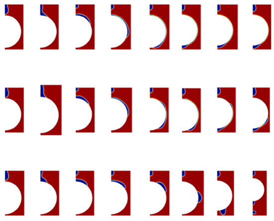 Killion [54] was one of the first to highlight the significant impact of wettability on falling film absorption efficiency. Jeong [42] introduced the concept of the wettability ratio, defined as the ratio of the wetted area of the tube surface to the total surface area, to characterize the wettability. Through two-dimensional simulations of the tube’s circumferential surface, it was shown that the heat and mass transfer coefficients change with the wettability ratio. However, under low flow conditions where droplet flow patterns prevail, the effect of wettability ratio is minimal. Subsequently, Arroiabe et al. [59] developed a three-dimensional model, further validating this conclusion. Castro et al. [60] conducted experimental and simulation studies, demonstrating that the wettability ratio is a key parameter in wettability research and is a function of the contact angle per unit length and the mass flow rate. Ji et al. [50] conducted two-dimensional simulations of the tube’s circumferential surface to evaluate the impact of the static contact angle and spray density on the wettability of hydrophilic tube surfaces (Figure 12) The results showed that the wettability ratio is directly proportional to spray density and inversely proportional to the static contact angle. The liquid film spreading speed increases with an increase in static contact angle, but decreases with an increase in spray density.