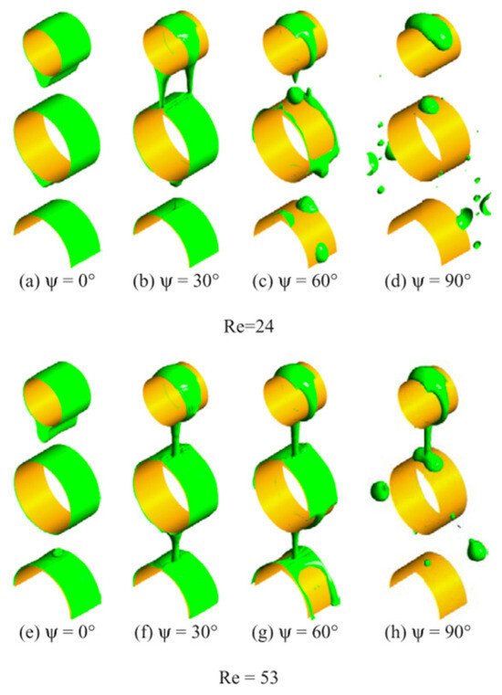 Most of the above studies were based on two-dimensional simulations or considered only the circumferential distribution of the liquid film, neglecting the axial wettability characteristics of the liquid film. Arroiabe et al. [59], building upon Castro’s work [60], established a three-dimensional transient numerical model to investigate the impact of the contact angle on liquid film wettability under droplet and column flow patterns (Figure 13). The results indicated that for each Reynolds number, there is a corresponding maximum contact angle that ensures complete wetting of the falling film. When the contact angle is smaller than this maximum value, the contact angle has no significant effect on the wettability ratio. However, when the contact angle exceeds this maximum value, the wettability ratio decreases as the contact angle increases. In the application of falling film heat exchangers, if higher wettability and heat transfer characteristics are desired, the surface contact angle cannot be neglected as a key factor.