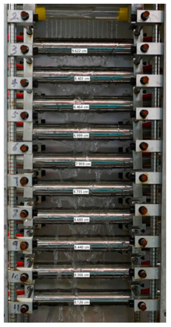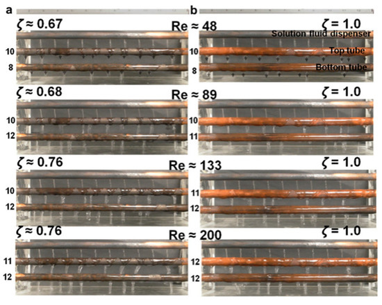 It is important to note that in actual falling film flow conditions, the gas flow rate and direction significantly influence the liquid film thickness and, consequently, the wettability ratio. In recent years, this has attracted increasing attention from researchers. Proper reverse gas flow can improve the liquid film distribution and enhance wettability. However, if the gas flow rate becomes too large, the tube surface may fail to form a steady falling film, leading to the formation of “dry spots” [9]. As shown in Figure 15, the blue regions represent areas where the liquid film thickness decreases under reverse gas flow, making it more prone to dry spot formation. Zhao et al. [9] studied the effect of lateral airflow and found that, in the absence of gas flow, the liquid film along the axis of the falling film tube exhibited a “saddle-shaped” distribution. As the gas flow rate increased, this saddle shape gradually disappeared, and the liquid droplets on the windward side of the tube shifted, worsening the wettability. Ruan et al. [66] showed that when the reverse gas flow rate exceeds 3.5 m/s, the tube surface fails to maintain a steady falling film, resulting in poor wettability. Zhu [67] used high-speed imaging and advanced image processing techniques to investigate the combined effect of operational and structural parameters on wettability, such as solution flow rate, tube array configuration, tube diameter, and inter-tube spacing. Wettability length was introduced to characterize the wettability of the external surface of the tube, defined as the axial spreading length of the liquid film on each tube row. Multi-row wettability of falling films is shown in Figure 16. A predictive correlation between wettability ratio and these parameters was established, as shown in Equation (6), with a prediction error of less than 10%.