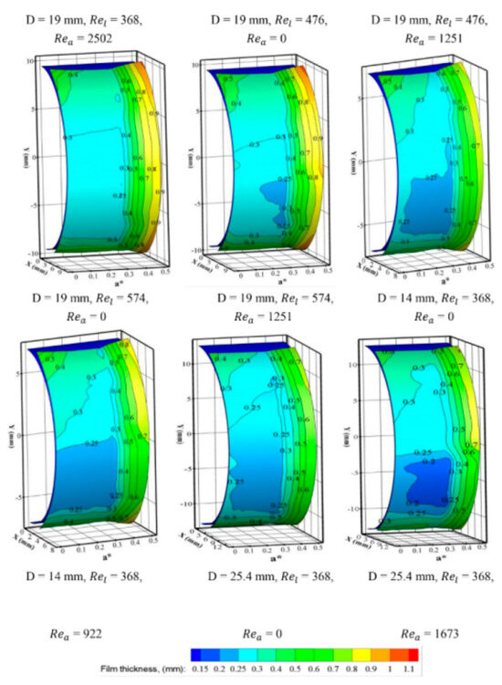 - In the axial distribution of the liquid film thickness, further expansion of the research scope to include a broader range of operational factors is needed to achieve a more comprehensive quantitative description.