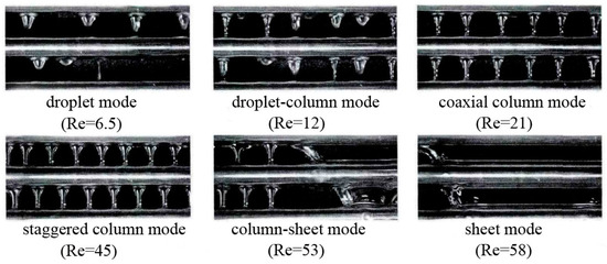 The identification of inter-tube flow patterns has been widely acknowledged among scholars. Mitrovic [68] was among the first to conduct visual experimental studies, demonstrating that with increasing flow rate, the inter-tube flow transitions sequentially through droplet, columnar, and sheet flow patterns. Hu and Jacobi [69] further refined this classification through a series of detailed visual experiments on various fluids, distinguishing flow patterns as droplet, droplet-column, aligned columnar, staggered columnar, column-sheet, and sheet flow. Sun [70] conducted similar flow pattern experiments using water and various concentrations of calcium chloride solution, confirming the same classification, as illustrated in Figure 17.