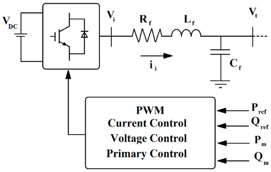 In this configuration, represents the DC-link voltage sourced from a big rack of batteries. The inverter’s internal voltage is modulated via pulse-width modulation (PWM) and controlled through a multilayer structure comprising current control, voltage control, and primary control loops that are usually based on droop control. The filter smooths the output voltage before injection into the grid. The measured active and reactive powers and are used in feedback to track reference setpoints and .