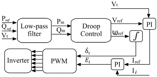 The overall control of the grid-forming inverter is illustrated in Figure 2. This schematic demonstrates how the droop control outputs are processed through voltage and frequency controllers to generate the modulation signals required for inverter operation.