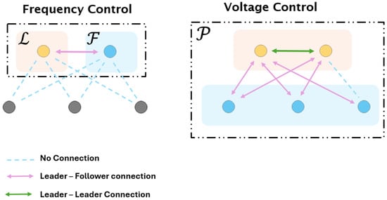 The total number of participating units is denoted by , consisting of follower devices and leaders, such that with . This partition allows leaders to inject global reference information, while followers contribute to distributed coordination based solely on local interactions. The communication structure used to build the Laplacian matrix is shown in Figure 4. These dynamics allow reference values—such as nominal frequency and voltage—to be disseminated across the network using only local information, ensuring decentralised coordination [56]. The parameter is used to give additional control objectives, and and are weighting factors for the leader group. The communication and control structure among GFM-leaders, GFM-followers, and SC-followers within the proposed leader–follower consensus framework is illustrated in Figure 5.