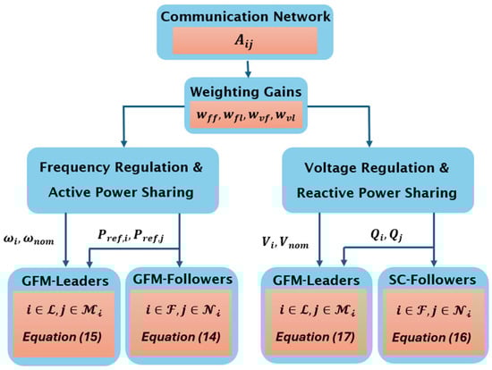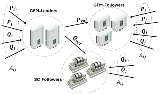 The overall structure of the proposed leader–follower consensus-based control framework, including its interaction with the communication network, is illustrated in Figure 6, highlighting the distinct roles of GFM-leaders, GFM-followers, and SC-followers in active and reactive power coordination.