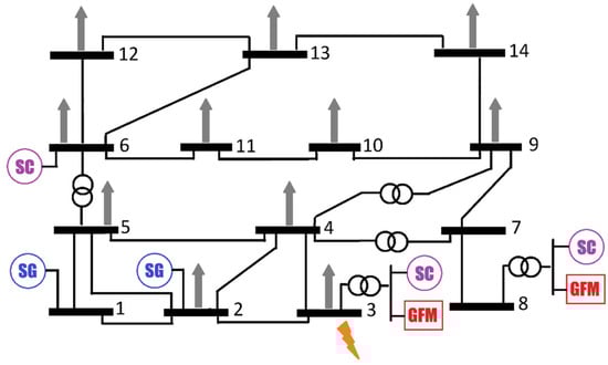 Modified IEEE 14-bus system setup with GFMs and SCs.