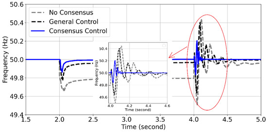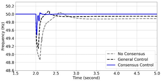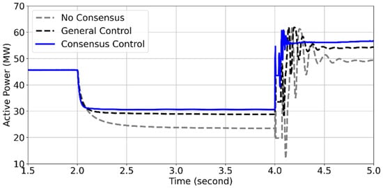The proposed leader–follower consensus control relies on peer-to-peer communication, which can be affected by latency, packet loss, and network attacks [60]. Latency may delay consensus updates, causing slower convergence or oscillations [61]. Packet loss can disrupt information flow and affect power-sharing accuracy, while attacks may compromise signal integrity and stability [62].