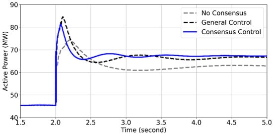 The first scenario introduces a step change in the active load at Bus 3 where an HSC is connected. At s, an increase of 30 in active power demand is applied. This test assesses the capability of the GFM-leaders at Bus 3 to restore system frequency through secondary consensus control, while the active power-sharing behaviour of the GFM-follower at Bus 8 is also monitored. The evolution of system frequency and active power outputs for both GFMs is recorded to verify coordinated response and proportional load sharing.