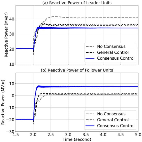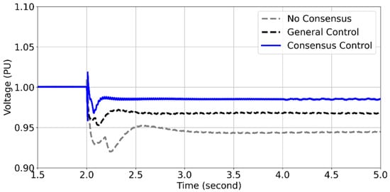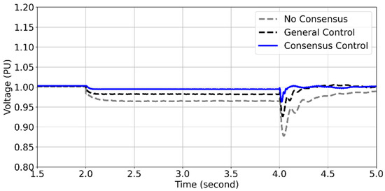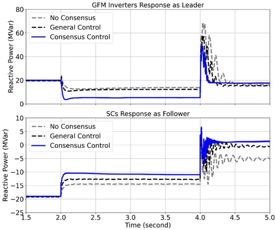 The second scenario applies to a reactive load disturbance at Bus 3. A step increase of 50 in reactive power demand is introduced at s. This scenario is used to evaluate the ability of the consensus-based voltage control mechanism to maintain voltage stability and coordinate reactive power sharing between the GFMs and SCs. The performance is assessed in terms of voltage regulation, var-sharing equality, and the suppression of circulating reactive currents.