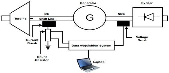 The experimental investigation was carried out on a fleet of large turbo-generators (over five units) ranging from 618 MW to 846 MW (22 kV). In each generator, both shaft current and shaft voltage were measured using a consistent configuration, as depicted in Figure 1. A high-impedance voltage sensing brush at the non-drive end (NDE) of the generator was used to pick up the shaft voltage signal, while a low-impedance current earthing brush at the drive end (DE) provided a path to ground through a shunt resistor. The shunt (0.0496 Ω, 150 A, 1100 W) was connected between the DE brush and ground, and the shaft current was measured across this resistor. In essence, the NDE brush captured the shaft’s electrical potential (voltage) relative to the ground, and the DE brush ensured the shaft was effectively grounded while allowing measurement of the grounding current. Both the voltage brush output and the current shunt output were connected to data acquisition equipment for simultaneous recording of the shaft voltage and shaft current waveforms.